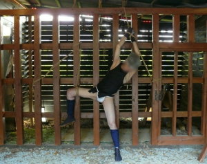 そのあと牢屋の外の格子に両手と片足を吊り上げ撮影。