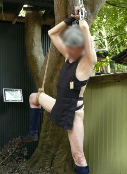 撮影した後、大きな木に両手両足を吊り上げたり、緊縛して