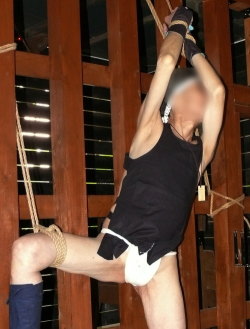 最後に壁の磔だいに手足を拘束し細い麻縄でPと玉を縛って